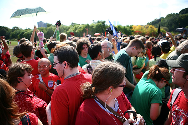 Upon arriving at the park, I was initially surprised. Not because of the cameras or the helicopter, but because of the people. Atleast 300 people had shown up(I’m just guessing) and every one of them was wearing a brightly coloured shirt. I guess I should have expected this, as they had told us to come this way. But I couldn’t get over how cool it was. To finally be at an improv event that I had been reading about for so long.
