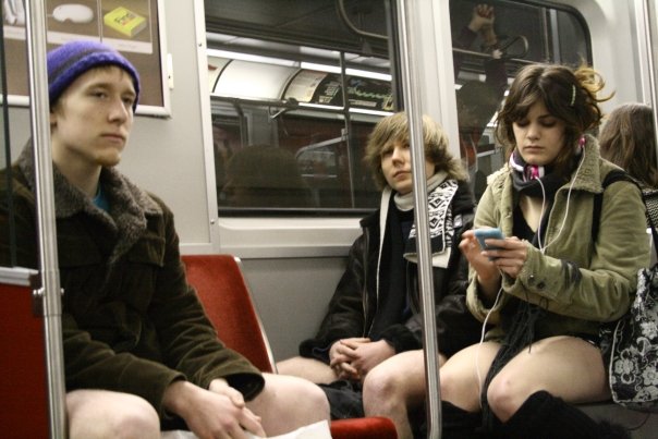 On a wintry Saturday afternoon, on January 10th, 2009, Improv In Toronto rallied over 300 people to get on the Yonge-University Spadina TTC line, wearing no pants. The “No Pants Subway Ride” mission, originally conceived by Improv Everywhere in New York in 2001. Now in its eighth straight year, 22 cities participated from Sydney to Calgary. Toronto’s “No Pants Subway Ride” had the second most people involved in this mission, after the New York event. Over 300 agents were spread out over an entire subway train, bafflng, surprising, and frightening thousands of transit riders.Four participants act casual